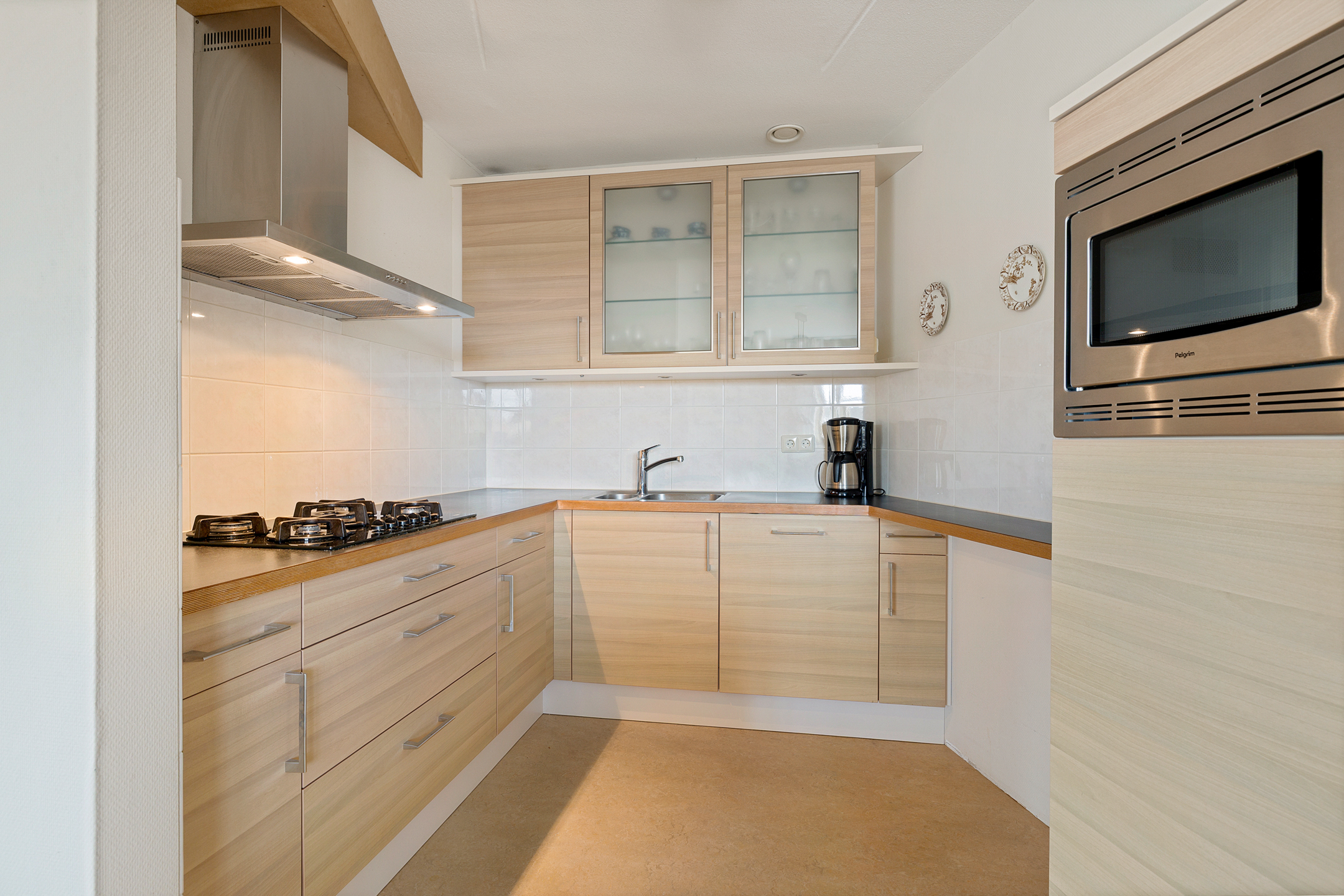 Open keuken met moderne inbouwkeuken voorzien van koel/vriescombinatie, vaatwasser, combi-oven, inductiekookplaat, afzuigkap en voldoende kastruimte.