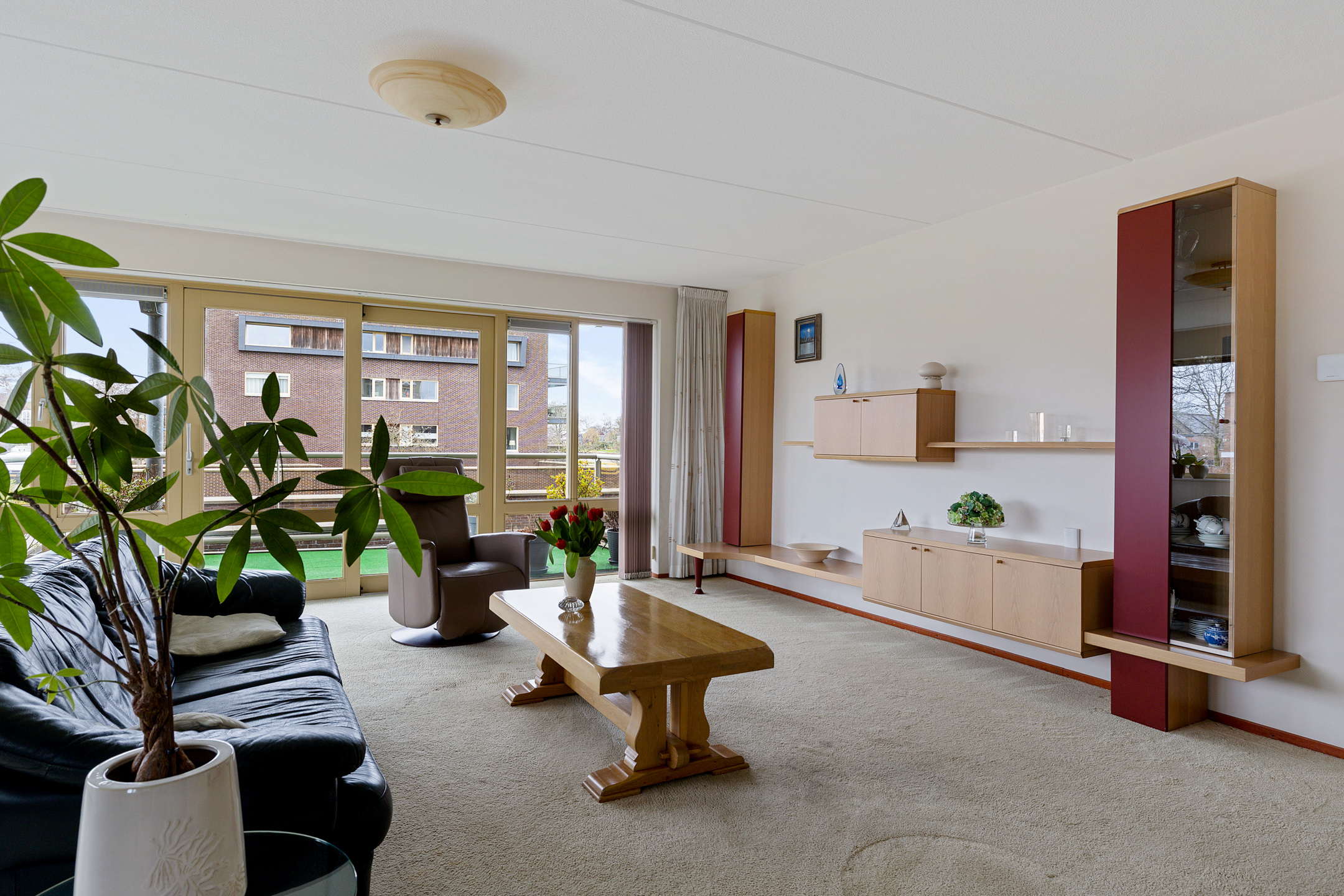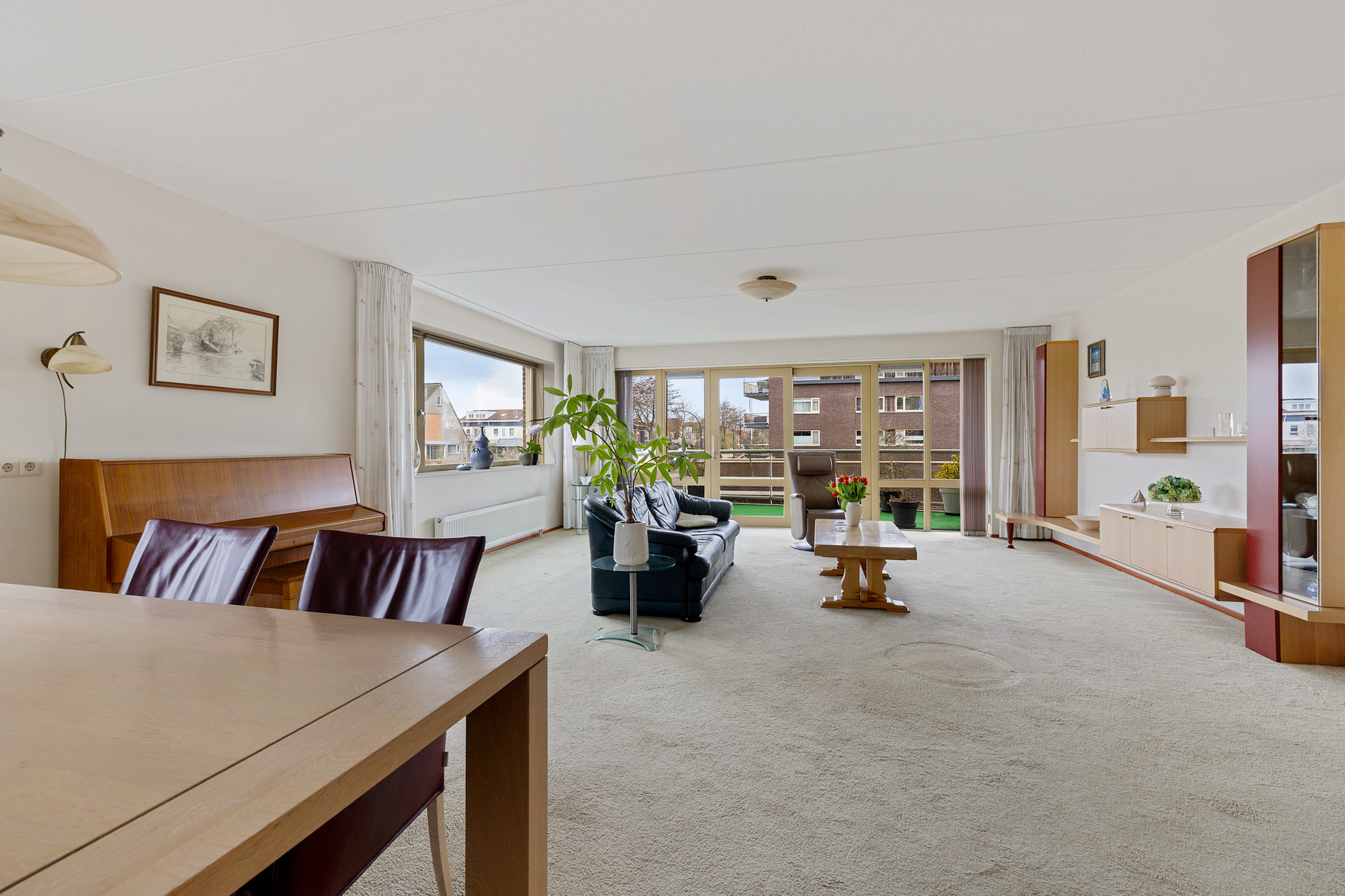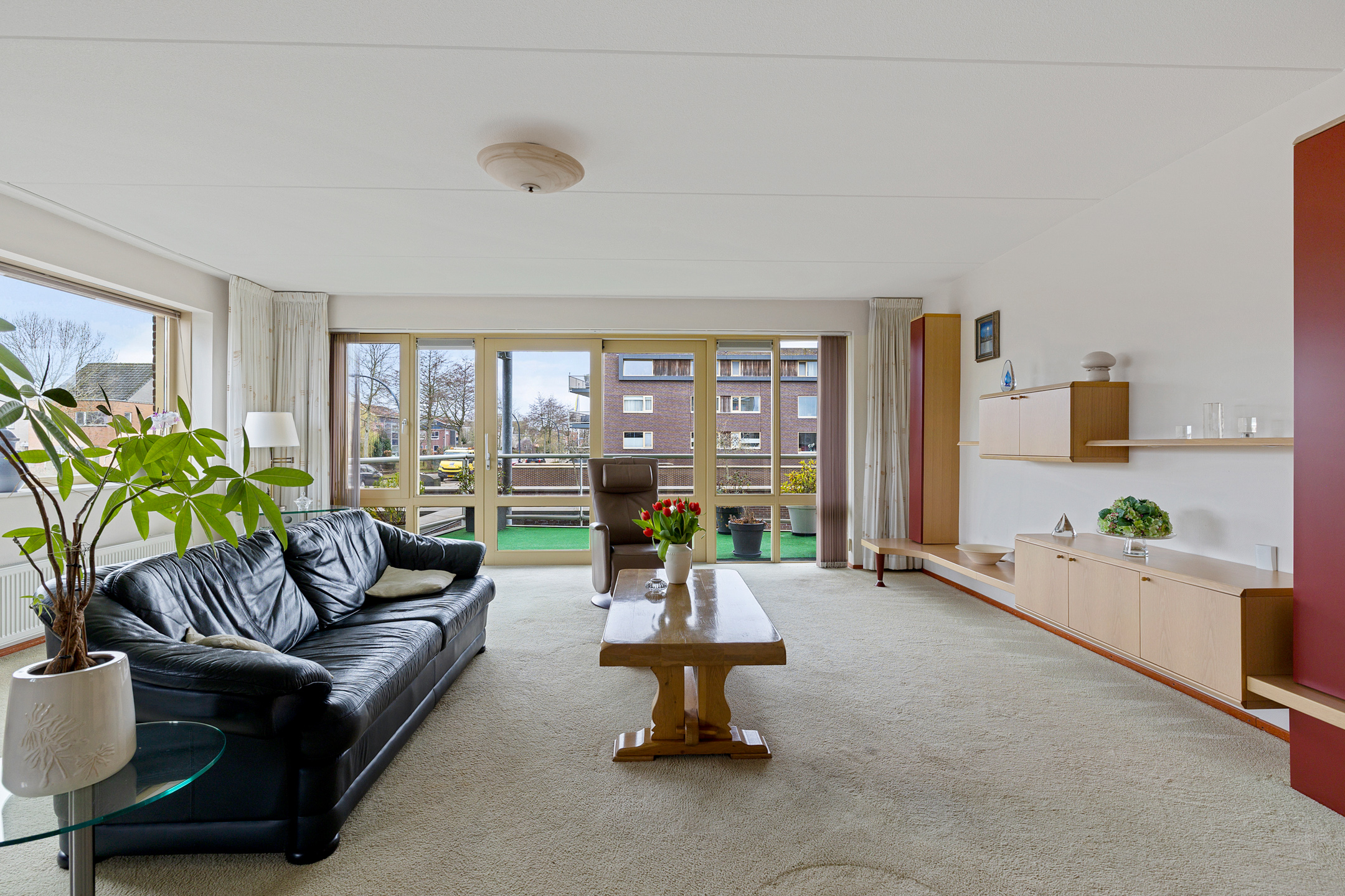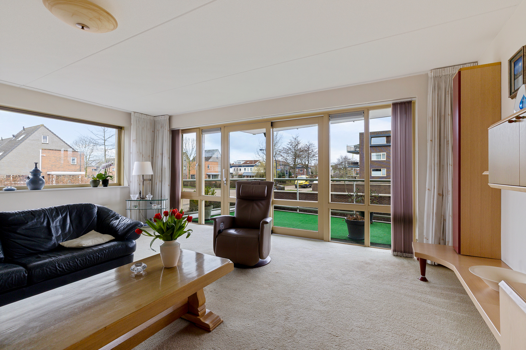 Royale woonkamer met prachtig uitzicht op alle bootverkeer en schuifpui naar het grote balkon aan de westkant met fantastisch uitzicht op het Van Harinxmakanaal.