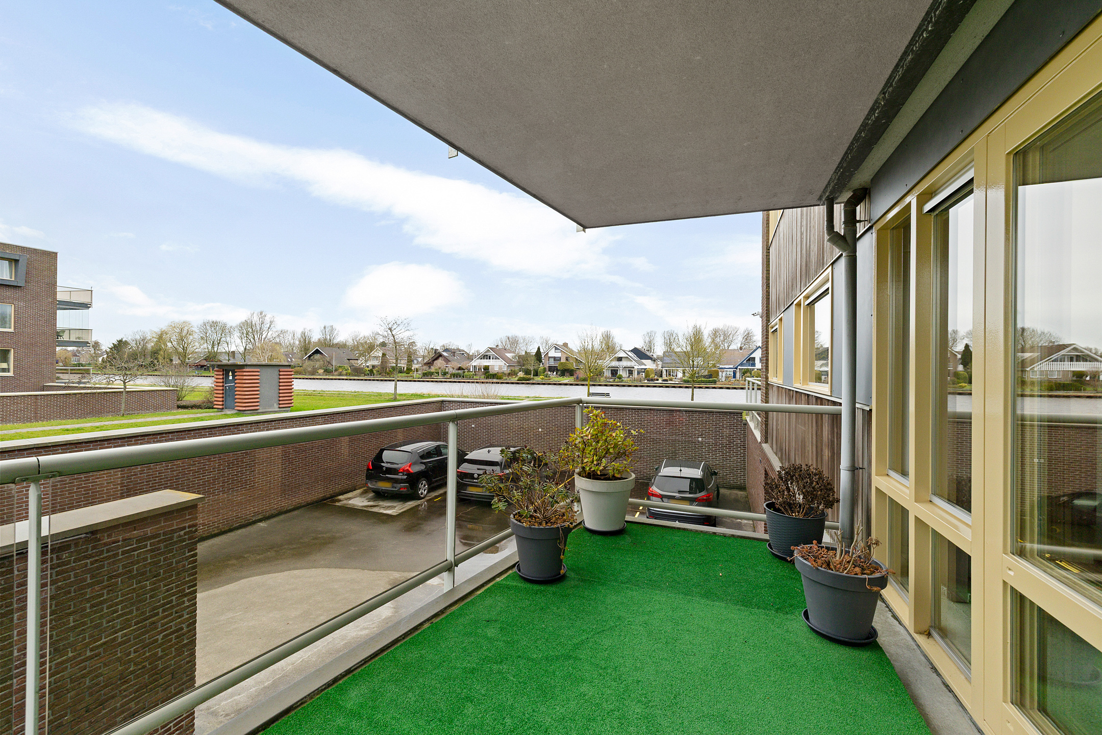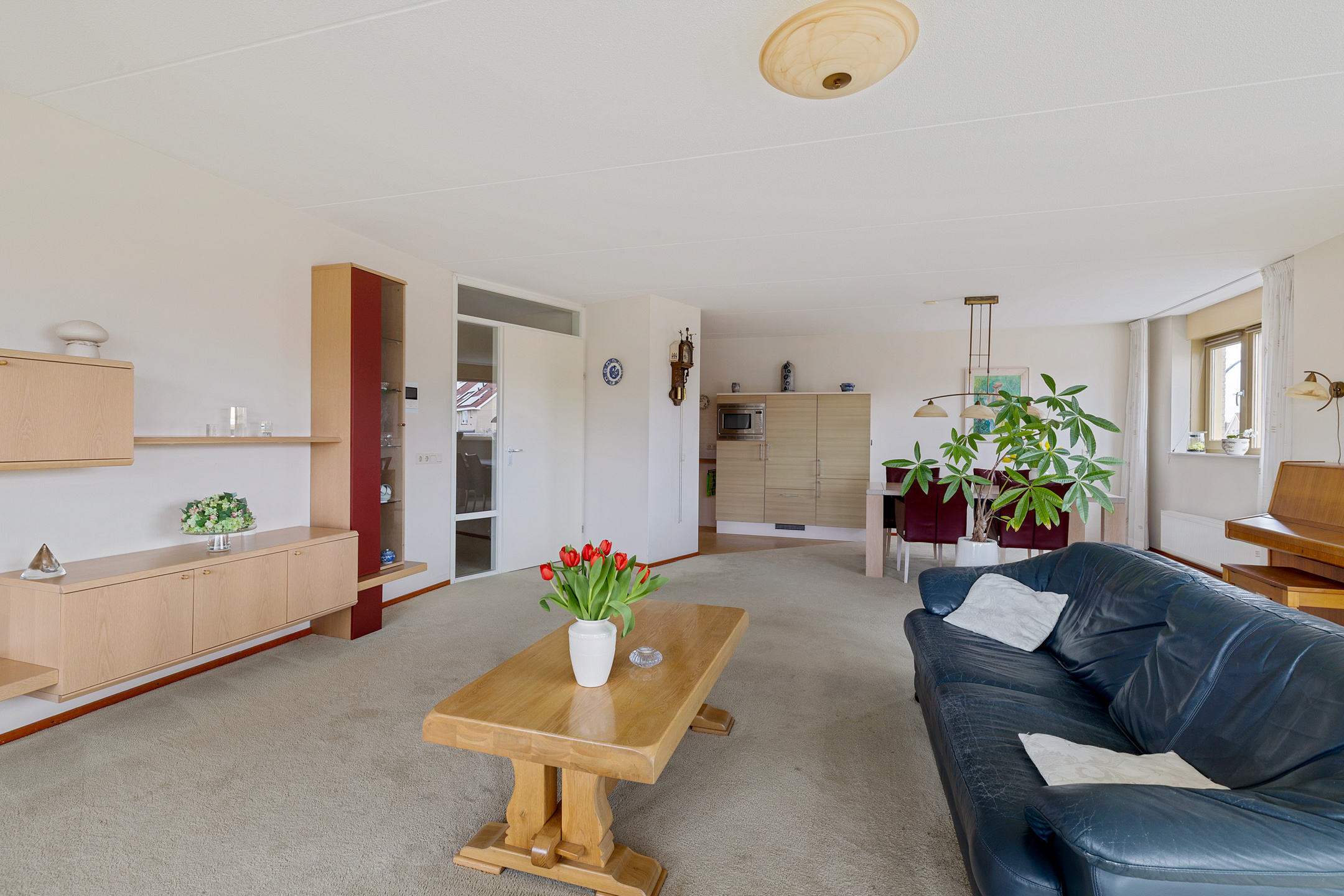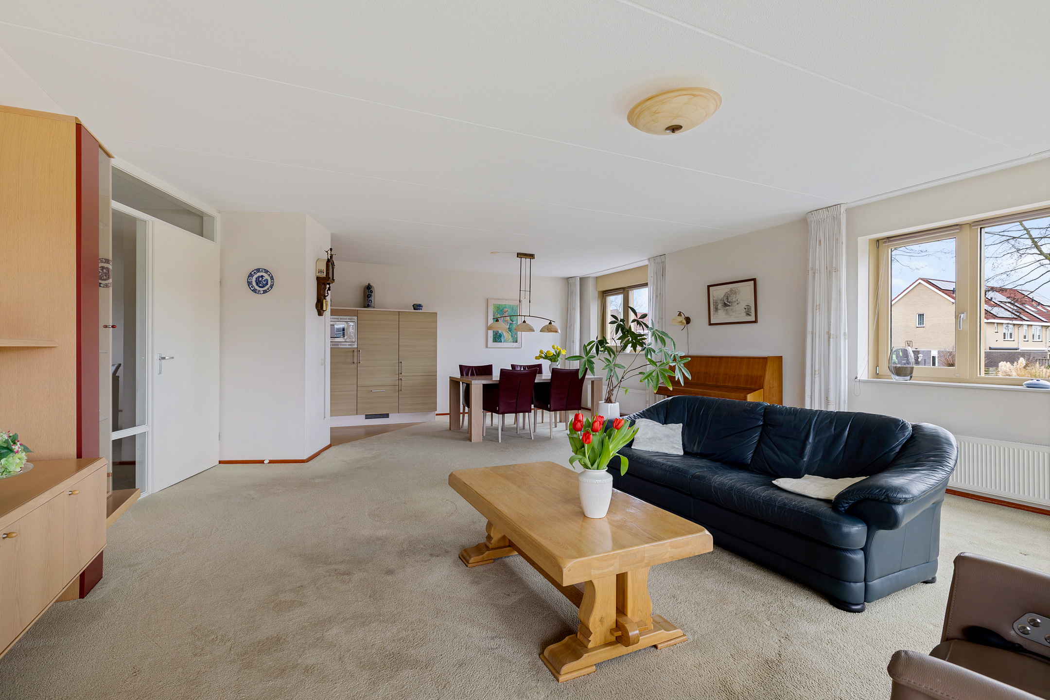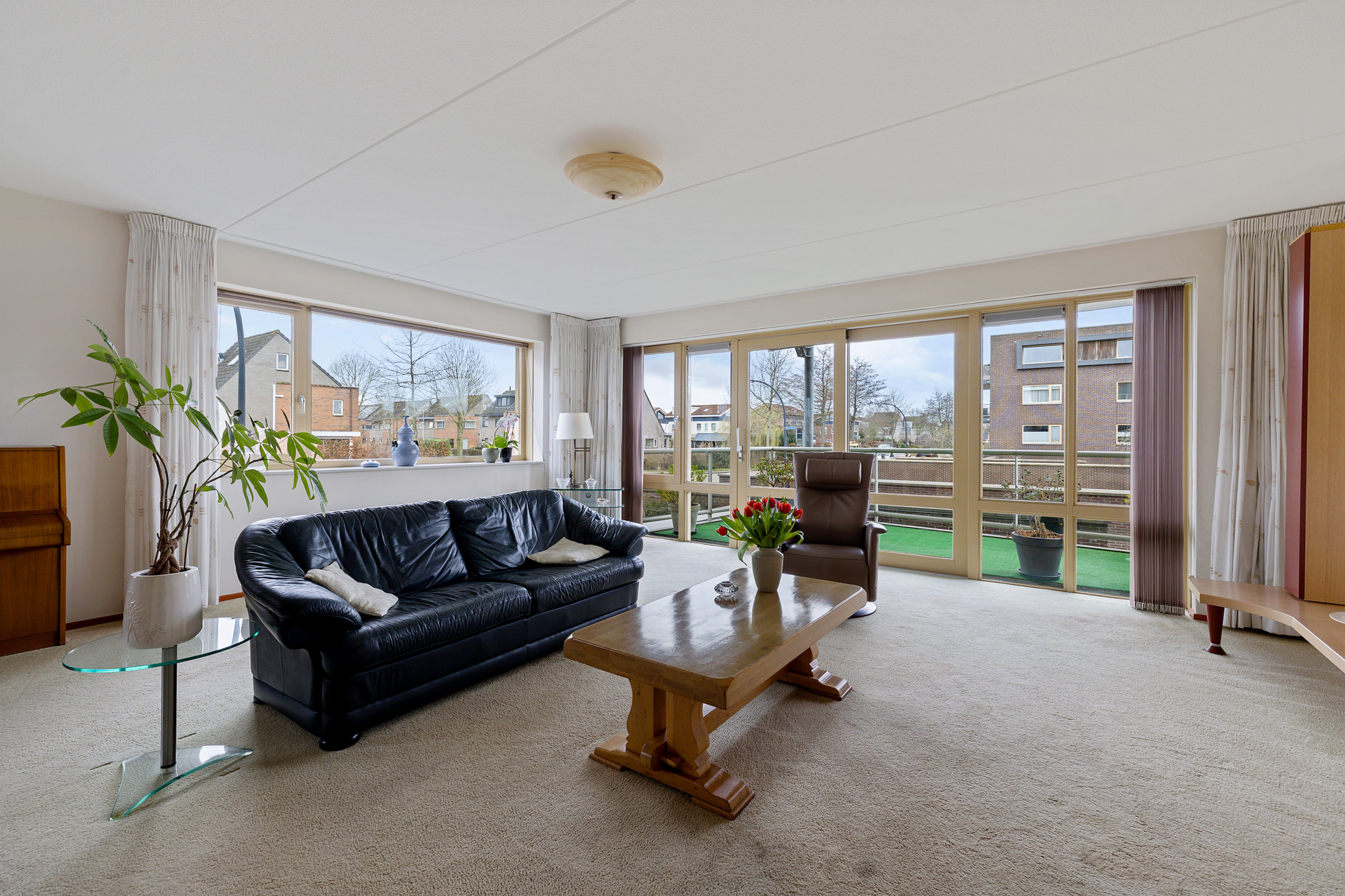 Royale woonkamer met prachtig uitzicht op alle bootverkeer en schuifpui naar het grote balkon aan de westkant met fantastisch uitzicht op het Van Harinxmakanaal.