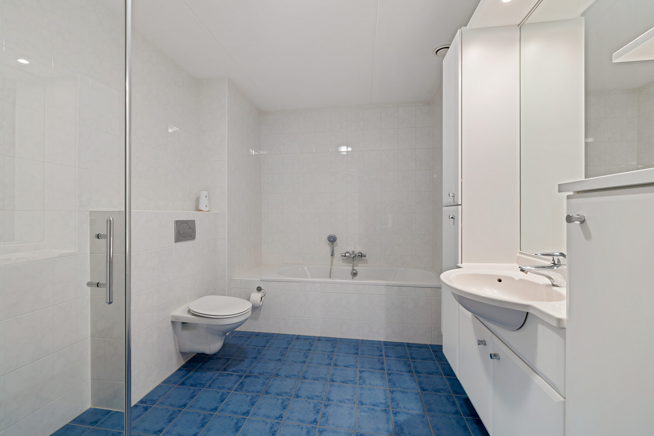 Indeling appartement: Grote hal/gang. Zwevend toilet. 2 slaapkamers(resp. 22 en 14 m2). Grote badkamer met ligbad, douche, 2e zwevend toilet en wastafelmeubel. Zeer ruime bijkeuken.