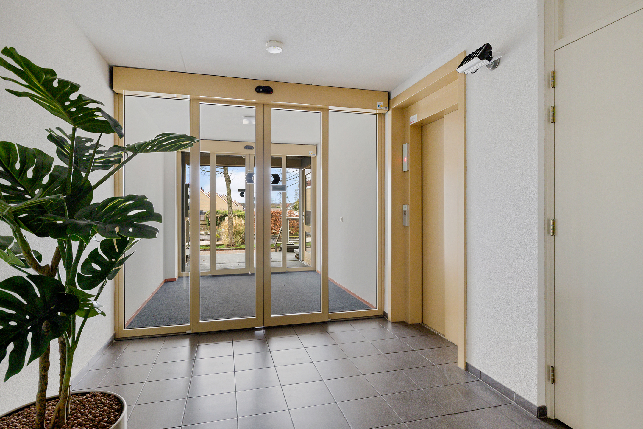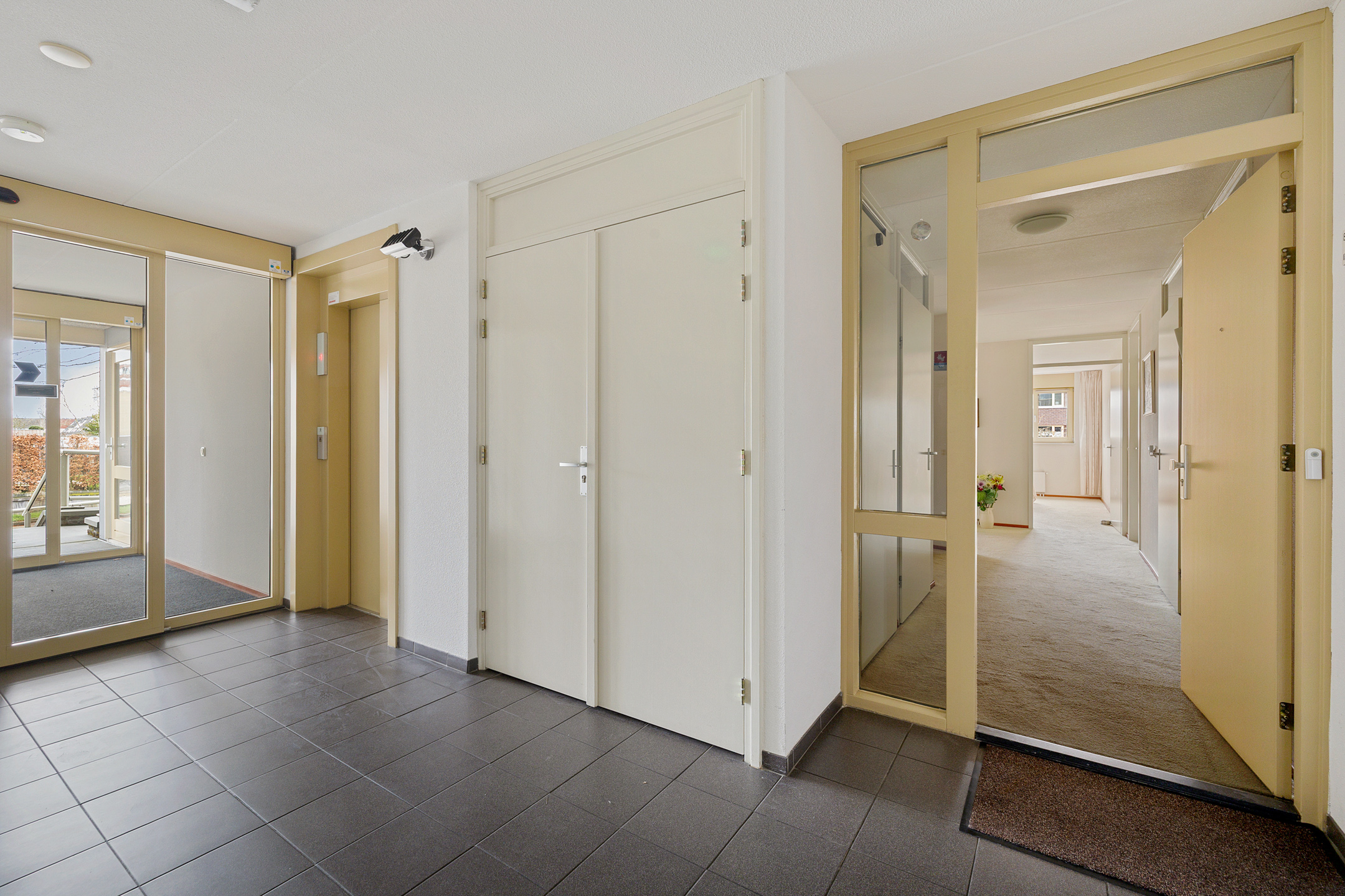 Centrale entree met intercom en liftinstallatie.